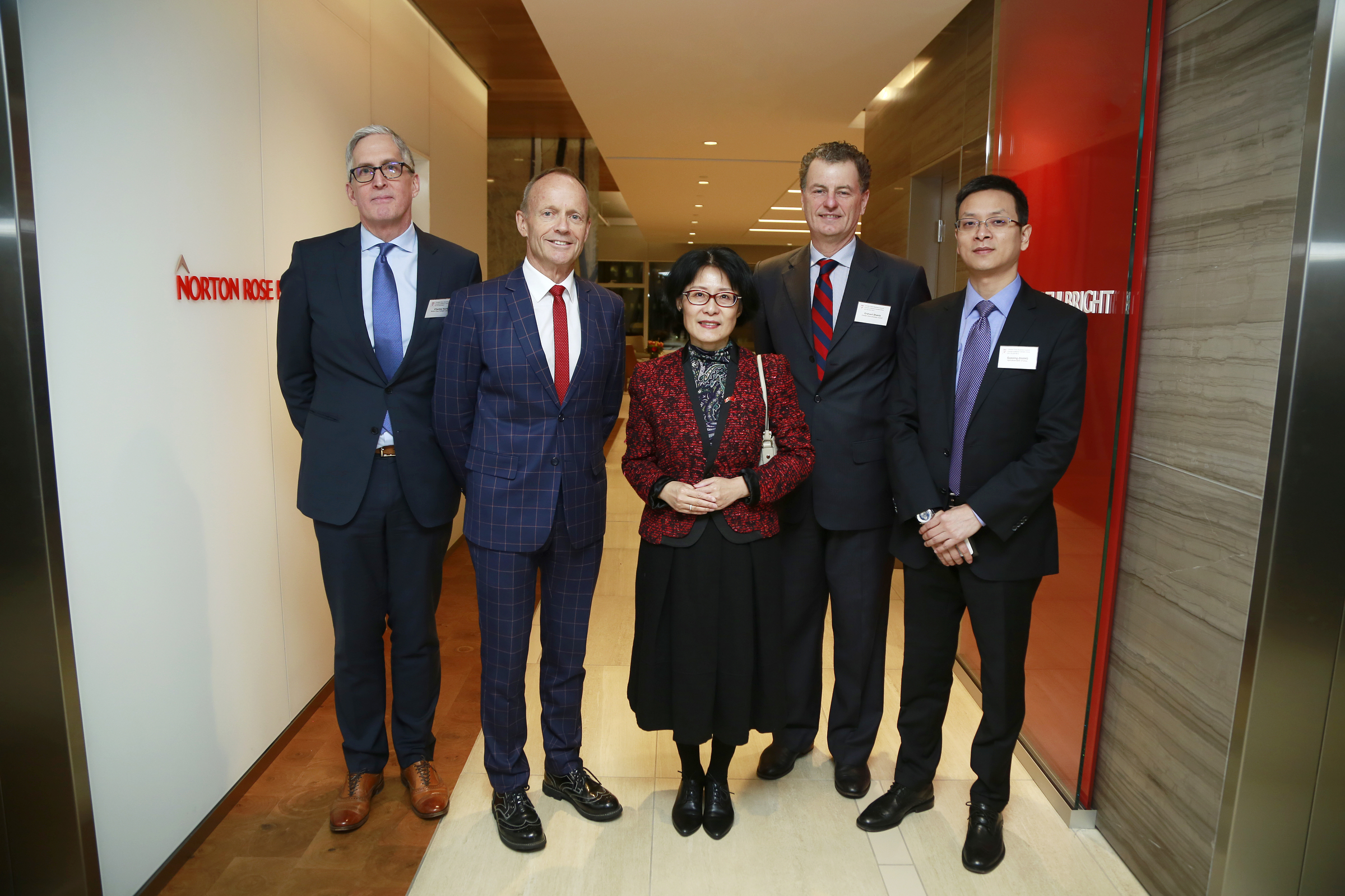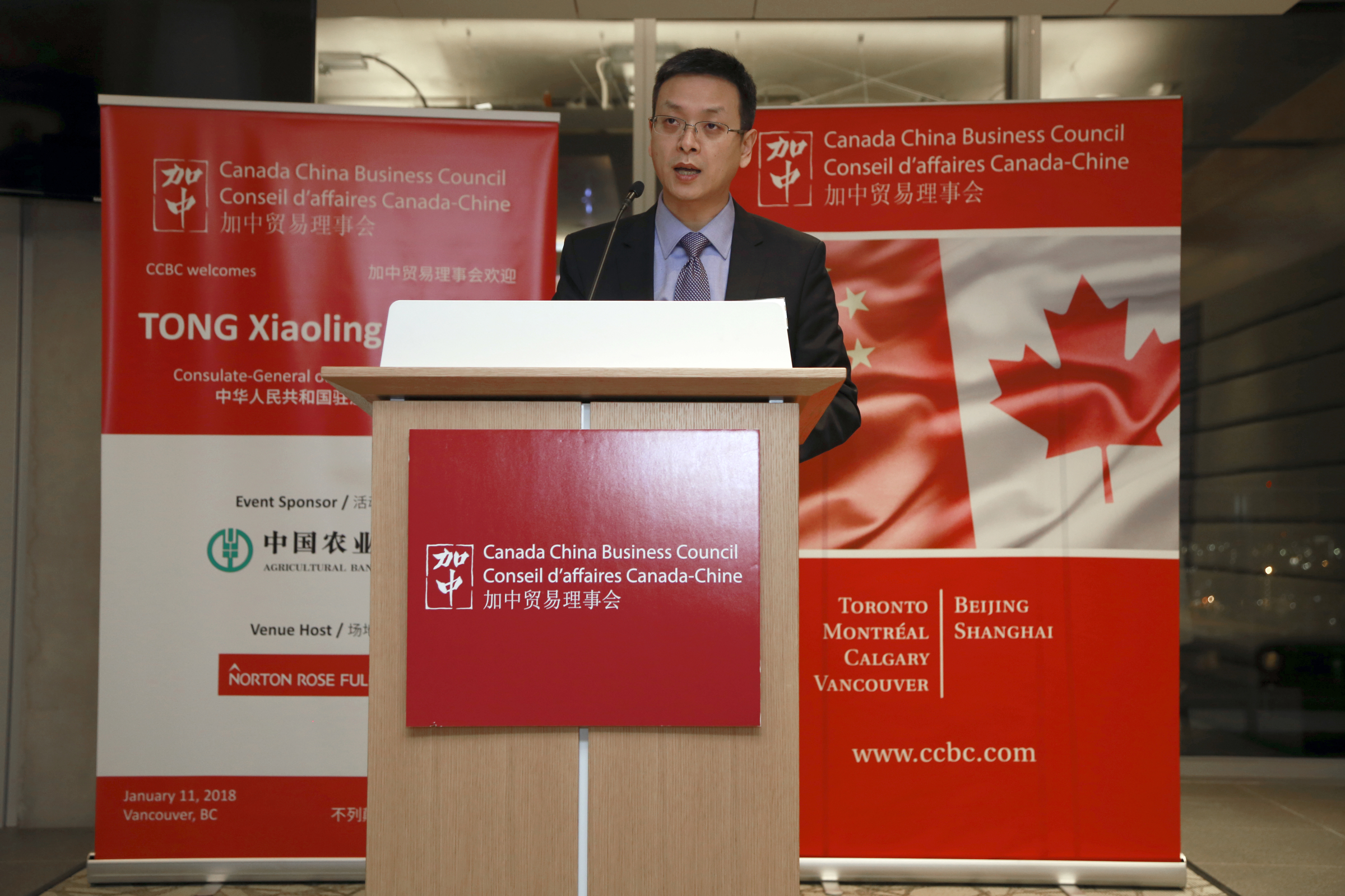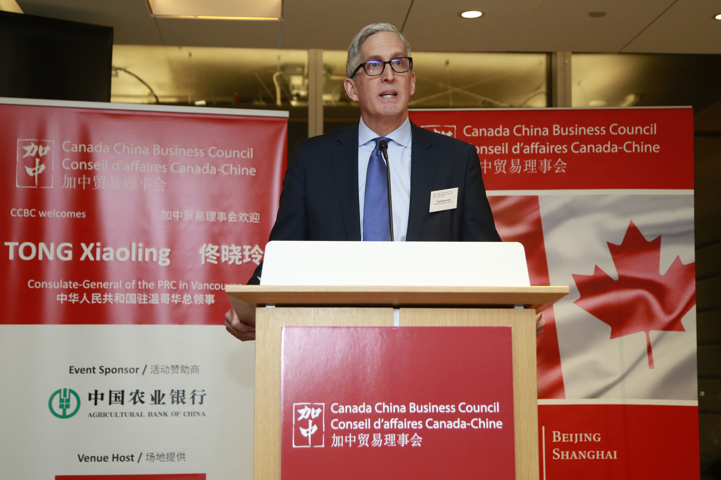Left to right: Charles E. Hurdon, Managing Partner- Canada, Norton Rose Fulbright Canada LLP; The Honourable Stockwell Day, a Vice-Chair of CCBC; TONG Xiaoling, Consul General of the PRC in Vancouver; Graham Shantz, President of CCBC; ZHANG Gouxing, Agricultural Bank of China.