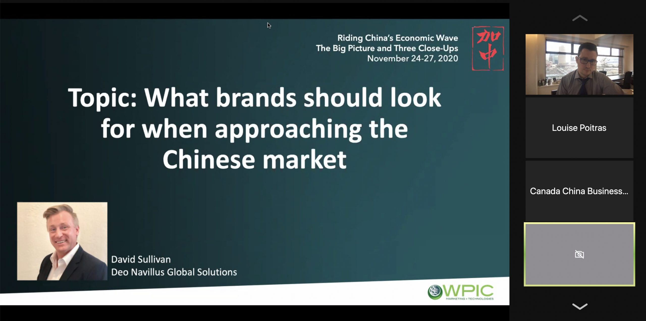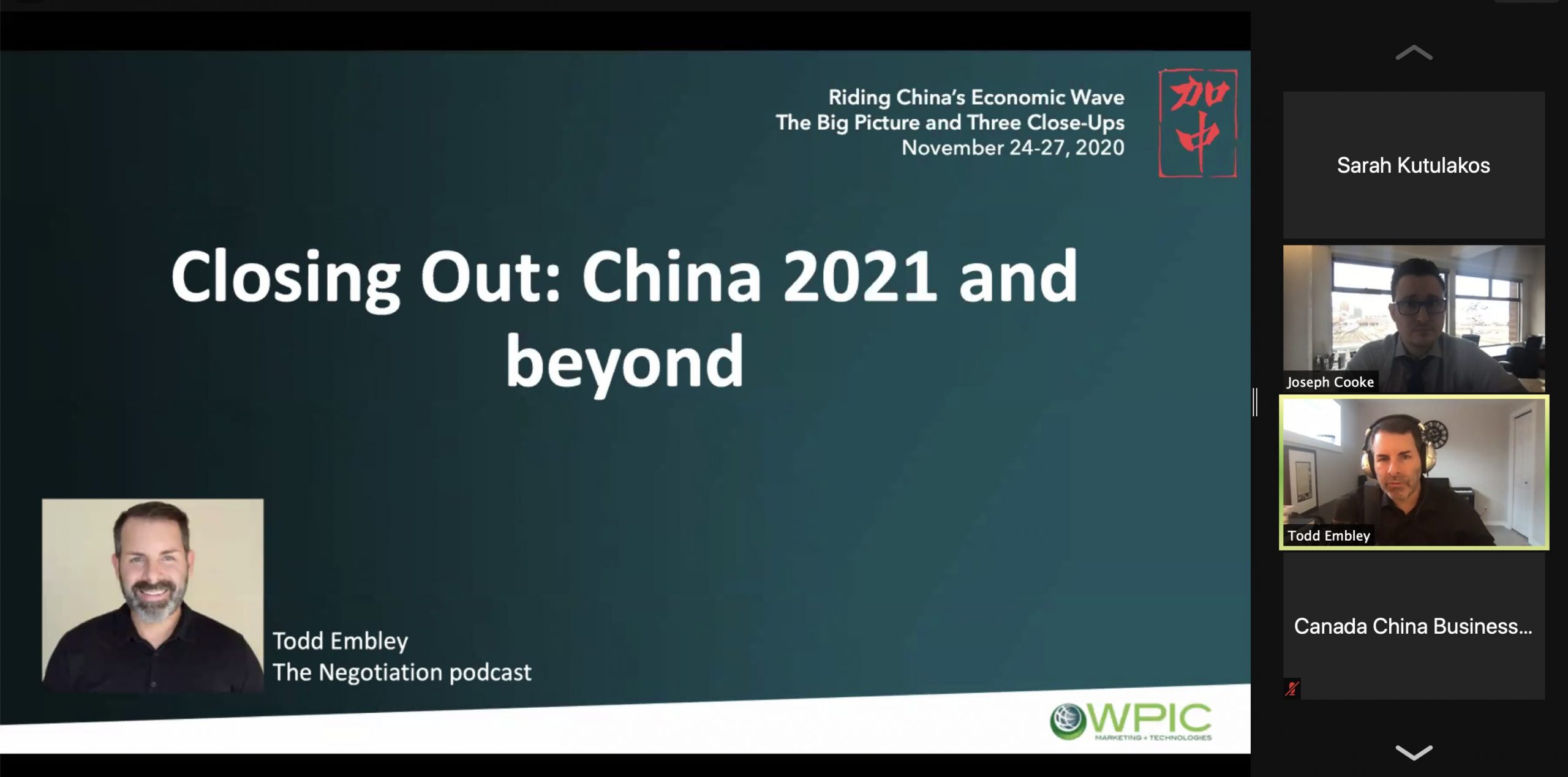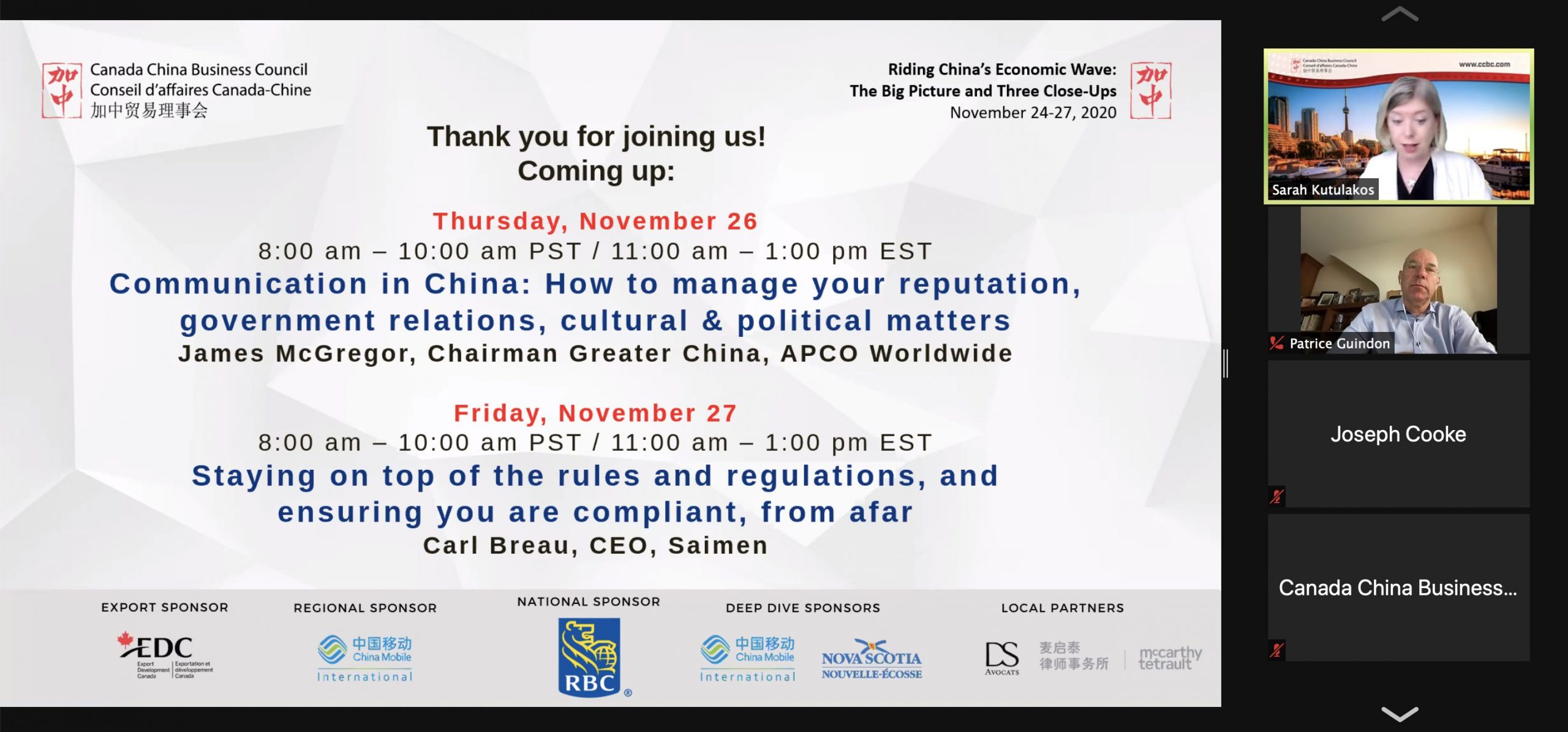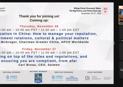 CCBC completed the first Interactive Deep Dive of its virtual event, Riding China’s Economic Wave: The Big Picture and Three Close-Ups, on November 25. Part of a larger program that ran from November 24-27, the virtual event was designed for Canadian companies doing business in China or considering this market in their global business plans. The program allowed participants to gain a better understanding of business in China, the opportunities available and the skills needed to be successful. Attendees received a comprehensive overview of topical business matters, heard case studies and joined a discussion with the speaker to apply learnings to their own companies.