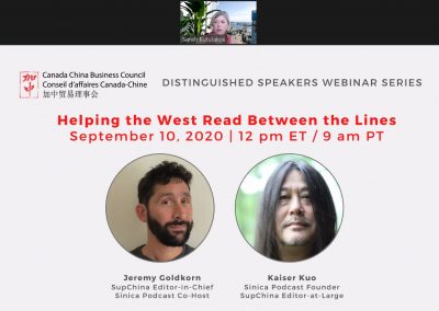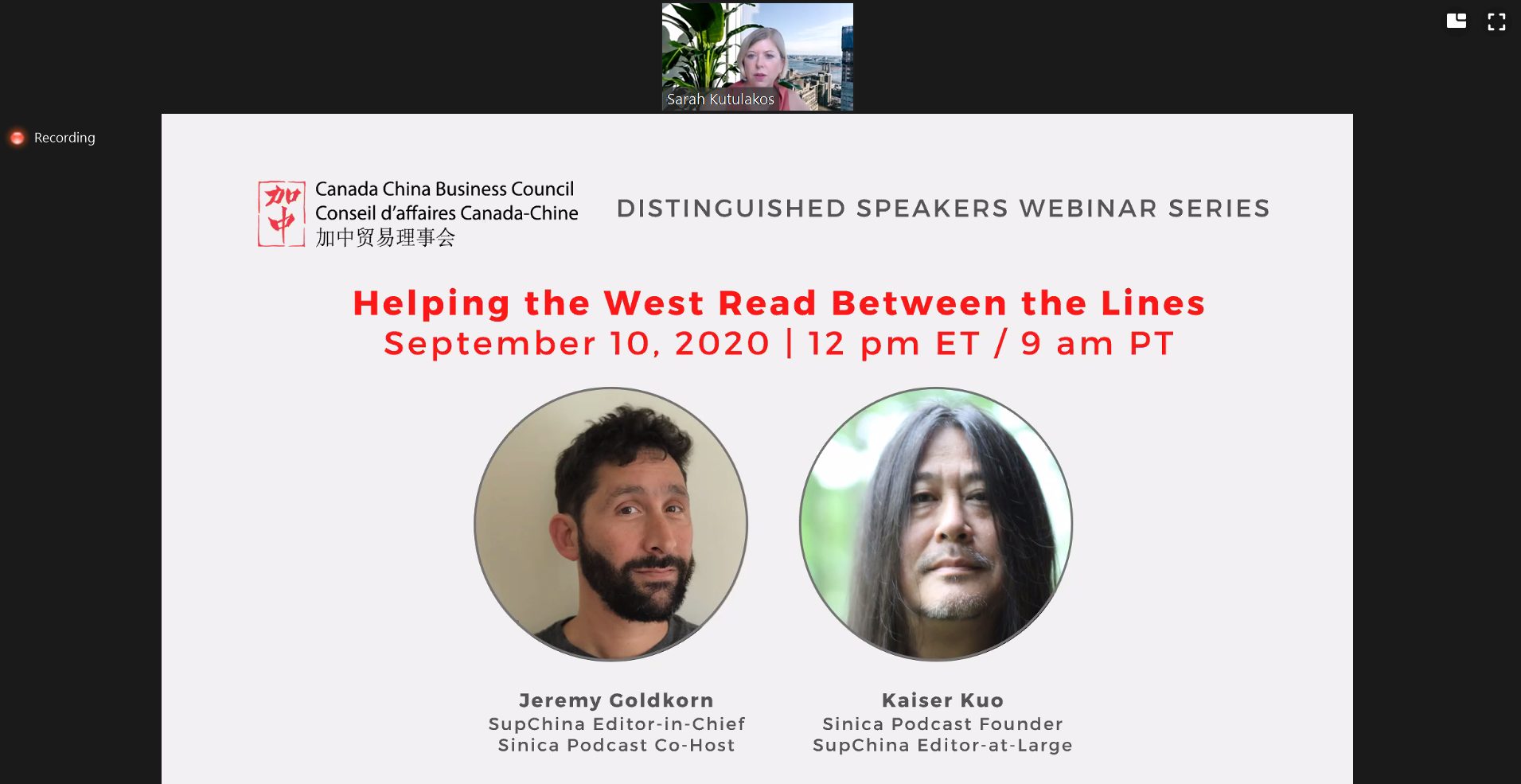 We kicked off the Distinguished Speakers series on September 10 with a pair well known to China hands, Jeremy Goldkorn and Kaiser Kuo of SupChina and the popular China-based Sinica Podcast. They were joined by CCBC Executive Director Sarah Kutulakos for a discussion on why it’s important for North America to have an “accurate, contextual understanding of China at a time when the need to understand China is higher than ever.”