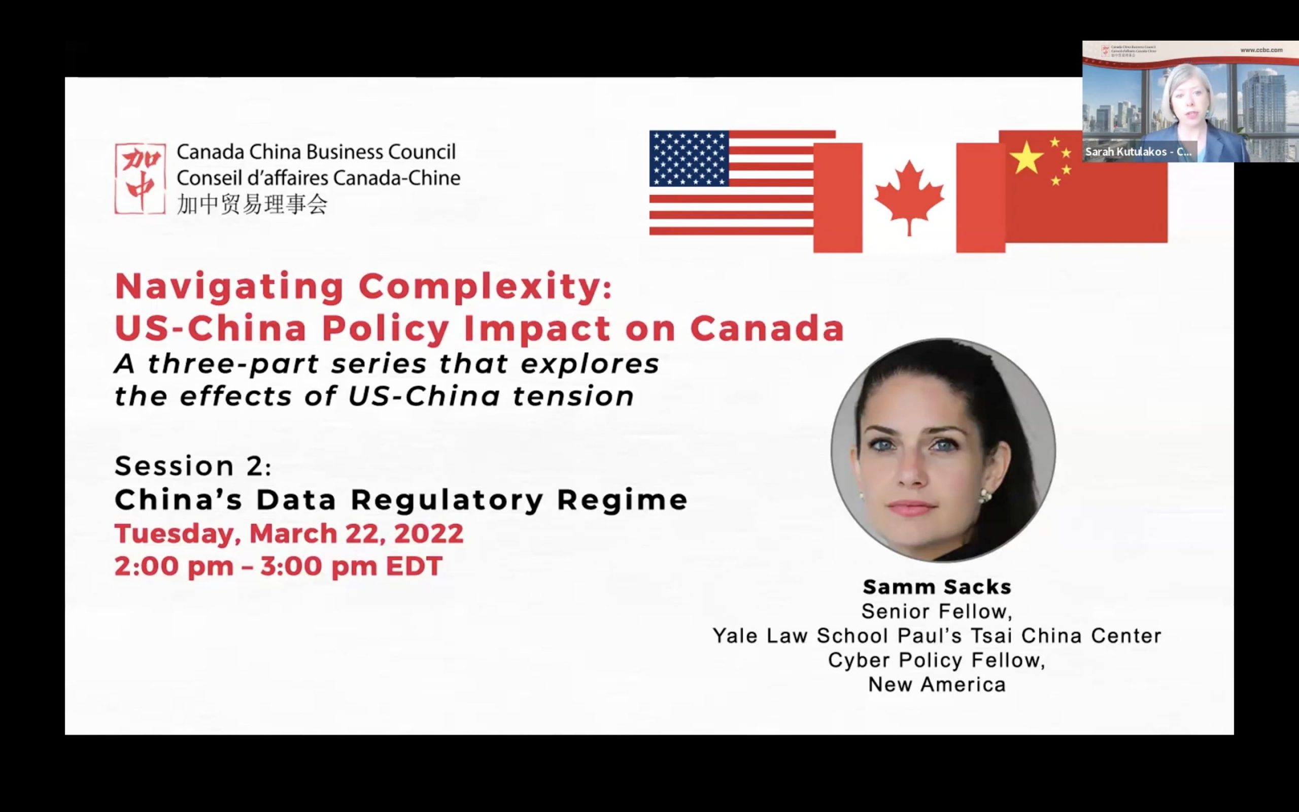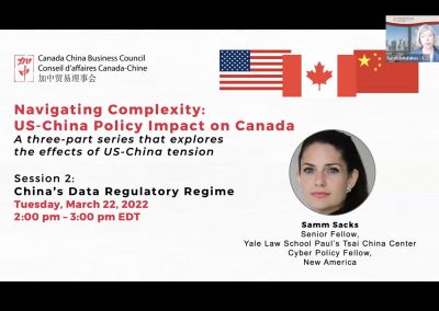 On March 22, 2022 at 2 pm EDT, the Canada China Business Council (CCBC) hosted Session #2 in the Navigating Complexity: US-China Policy Impact on Canada three-part webinar series. This – like the morning session – featured Samm Sacks, Senior Fellow at Yale Law School Paul Tsai China Center & Cyber Policy Fellow, New America.