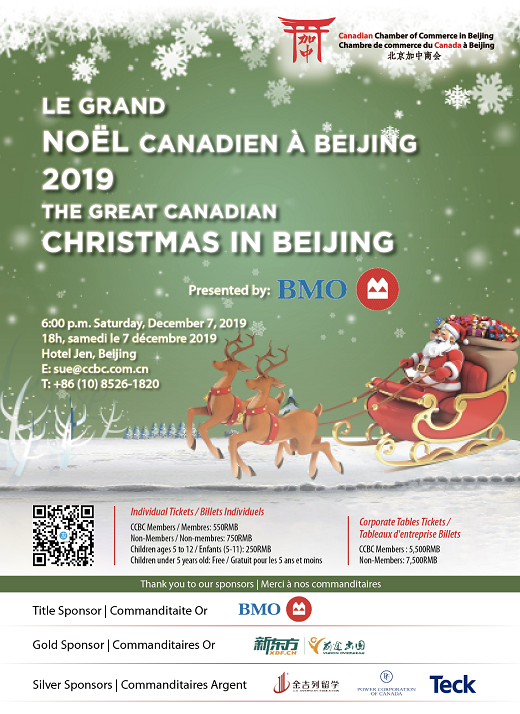 The Canadian Chamber of Commerce in Beijing hosted over 160 friends and family members at its annual Canadian Christmas party on December 7, 2019. Lilith and Her Jazz Fellas provided seasonal music and Dashan joined in the celebration. The festivities featured a delicious Canadian holiday-inspired menu with some great prizes from Air Canada, Canada Goose, and others.